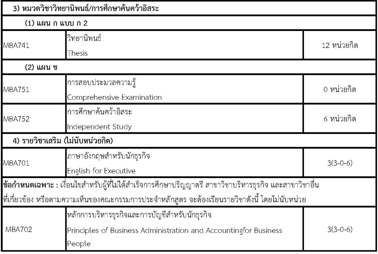 3) สำหรับผู้ที่ไม่สำเร็จการศึกษาในสาขาวิชาด้านบริหารธุรกิจ หรือเกี่ยวข้องจะต้องเรียนรายวิชาปรับพื้นฐานตามที่หลักสูตรกำหนดโดยไม่นับจำนวนหน่วยกิตในการสำเร็จการศึกษา